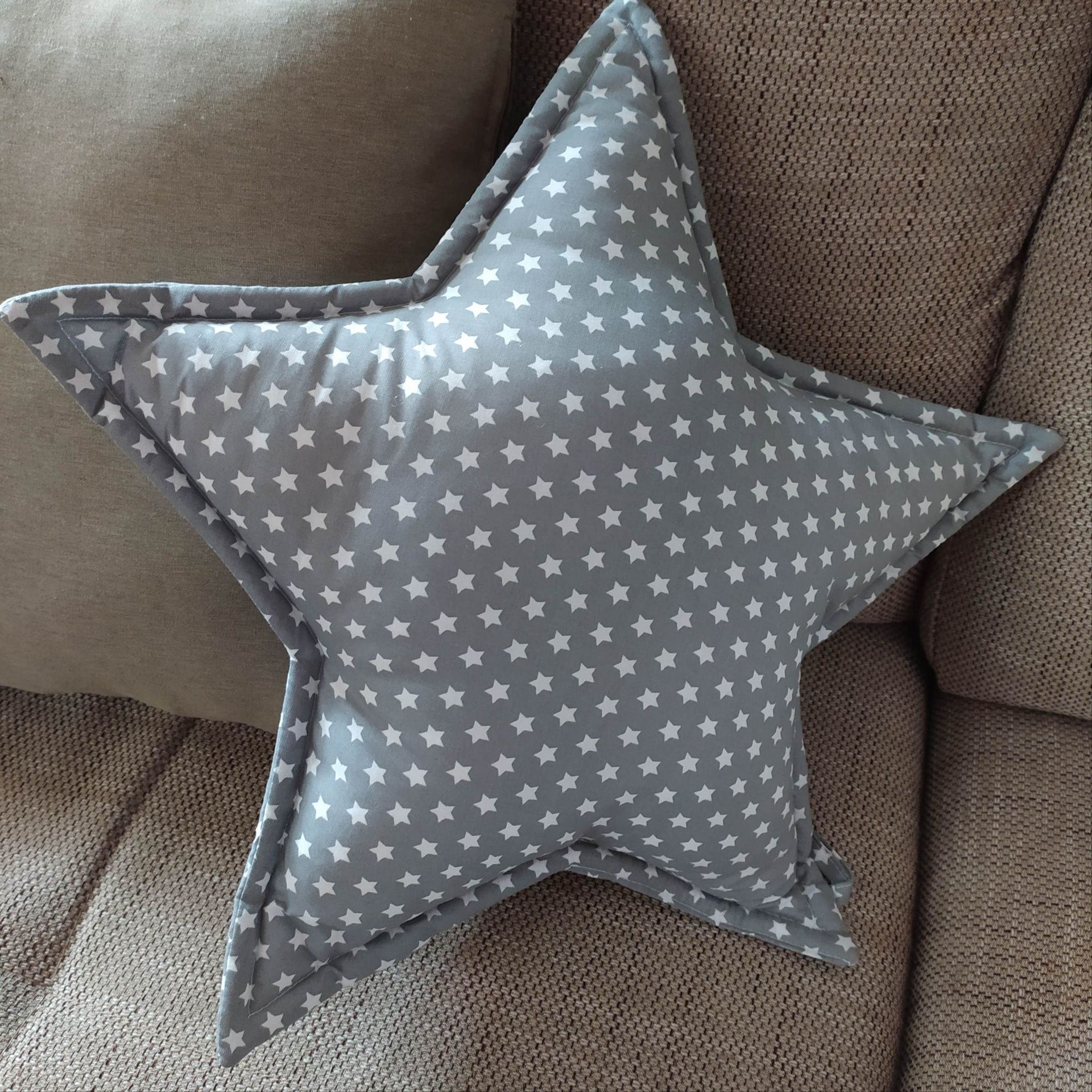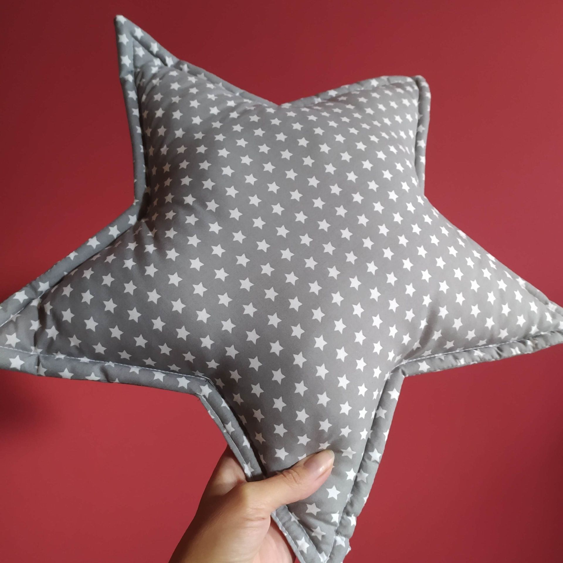 Dekorační polštářek ve tvaru hvězdy z bavlněné s drobnými bílými hvězdičkami. Polštářek je v přední straně vyztužený, aby hezky držel tvar. Bohatě naplněný.