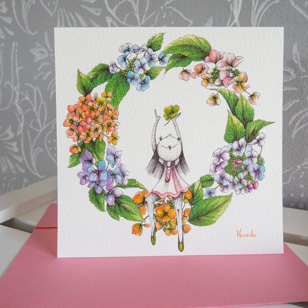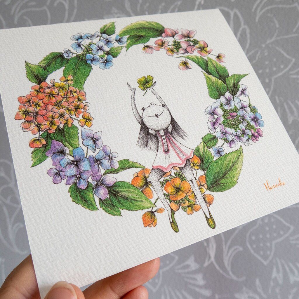 Blahopřání tištěné na specialní aquarelové čtvrtce 230g s mírným vzorem. Jedná se o reprodukci autorské kresby Hanunka. K přání patří i barevná obálka.