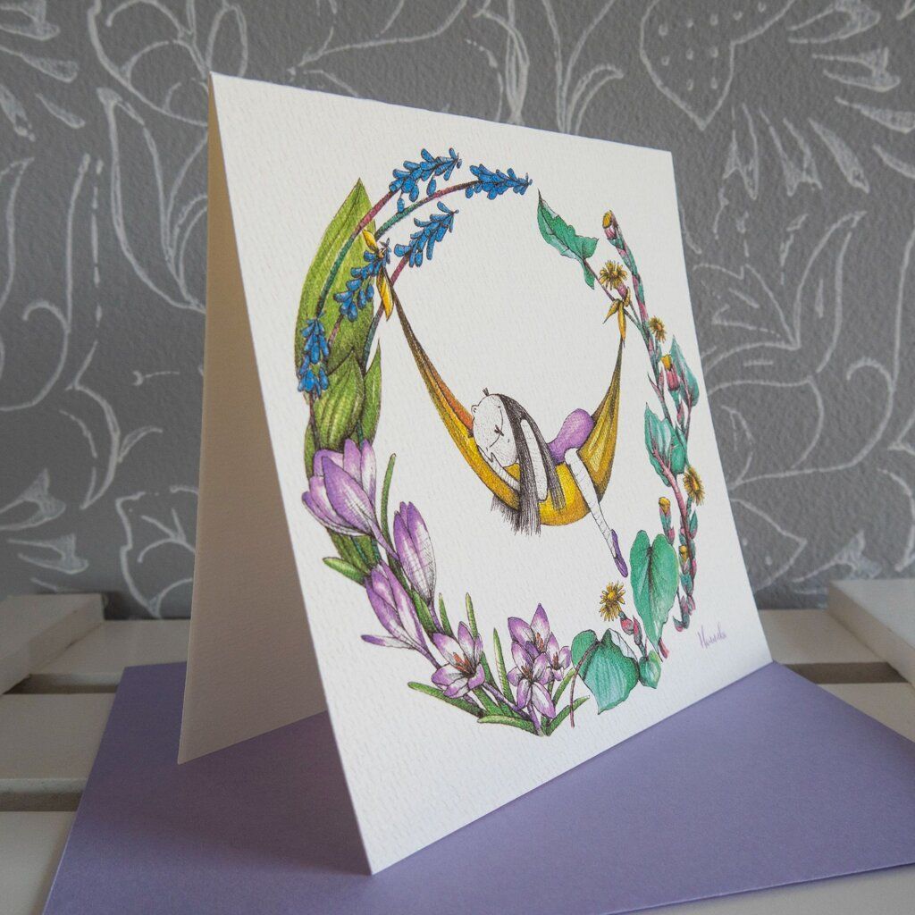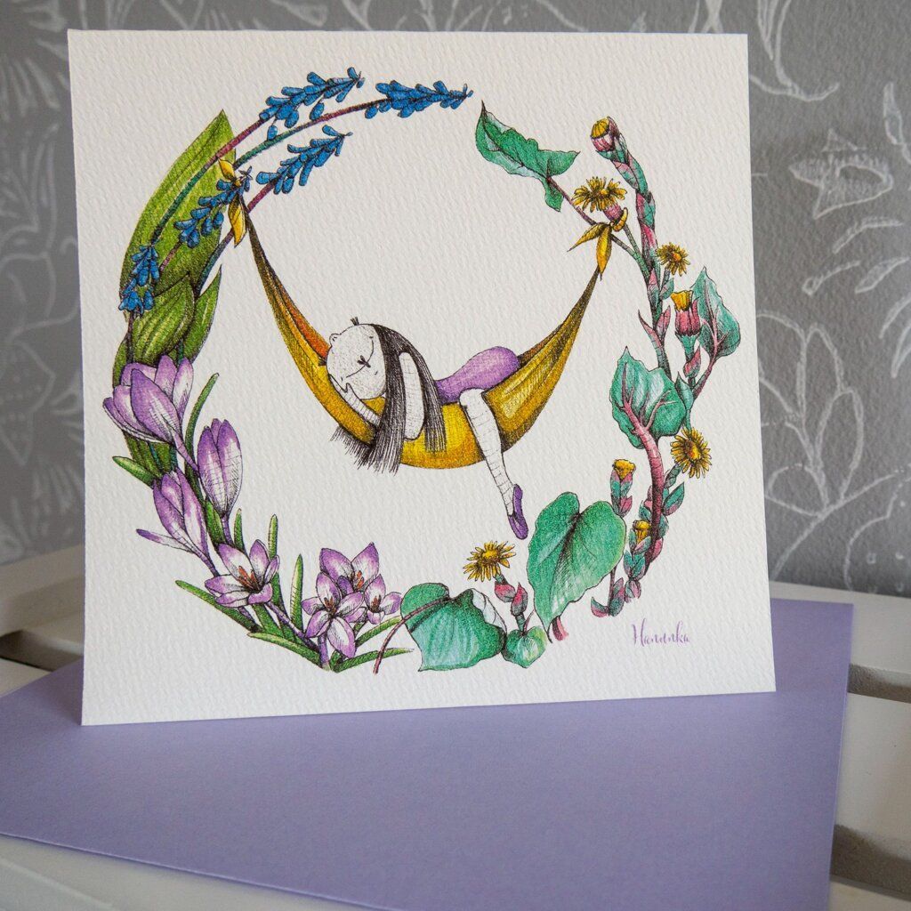 Blahopřání tištěné na specialní aquarelové čtvrtce 230g s mírným vzorem. Jedná se o reprodukci autorské kresby Hanunka. K přání patří i barevná obálka.