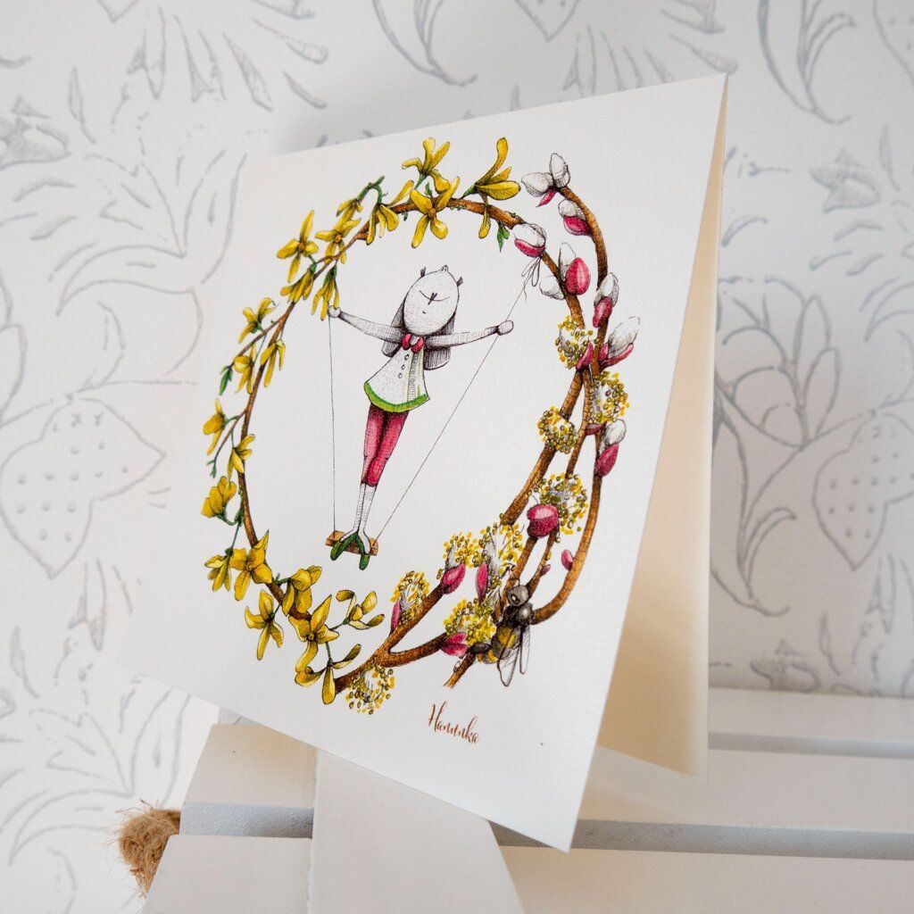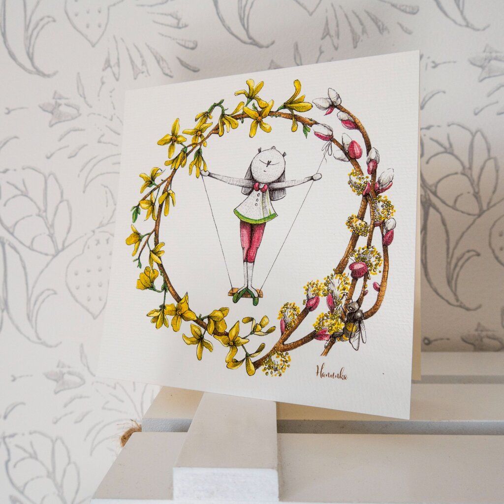 Blahopřání tištěné na specialní aquarelové čtvrtce 230g s mírným vzorem. Jedná se o reprodukci autorské kresby Hanunka. K přání patří i barevná obálka.