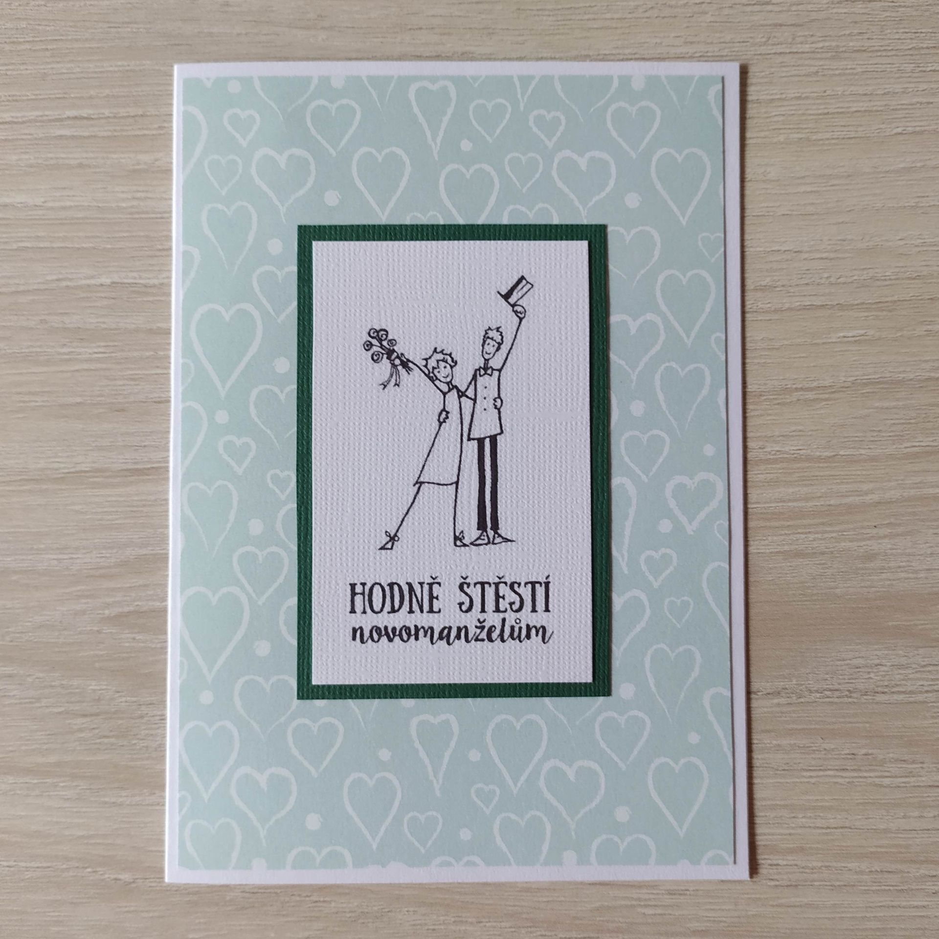 Ručně vyrobené blahopřání ze speciálních designových papírů. Blahopřání je zdobené originálním motivem se svatební tématikou. K přání patří také obálka. Podklad blahopřání i obálka jsou v barvě čistě bílé. Vše baleno v celofánovém sáčku. Blahopřání je uvnitř bez textu.