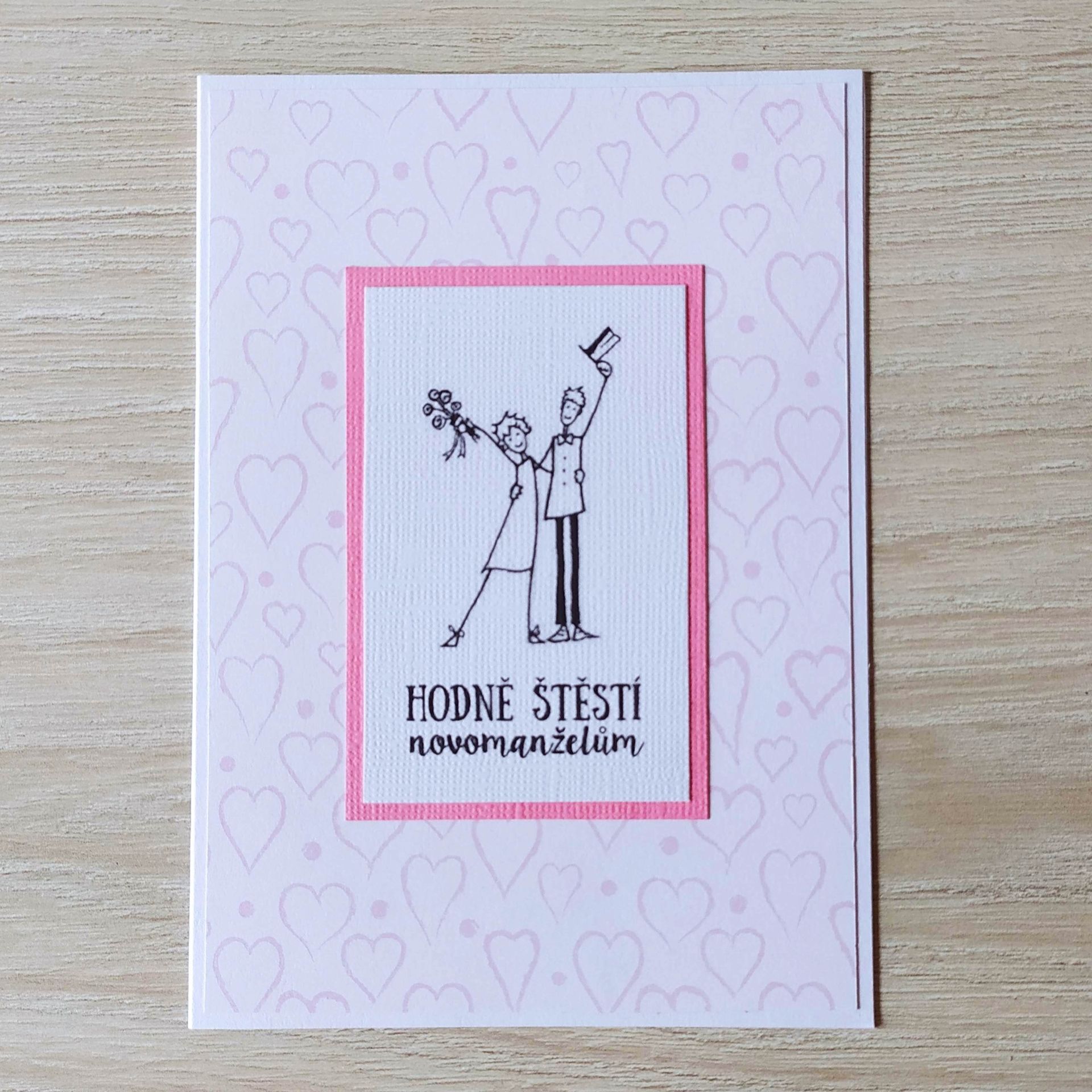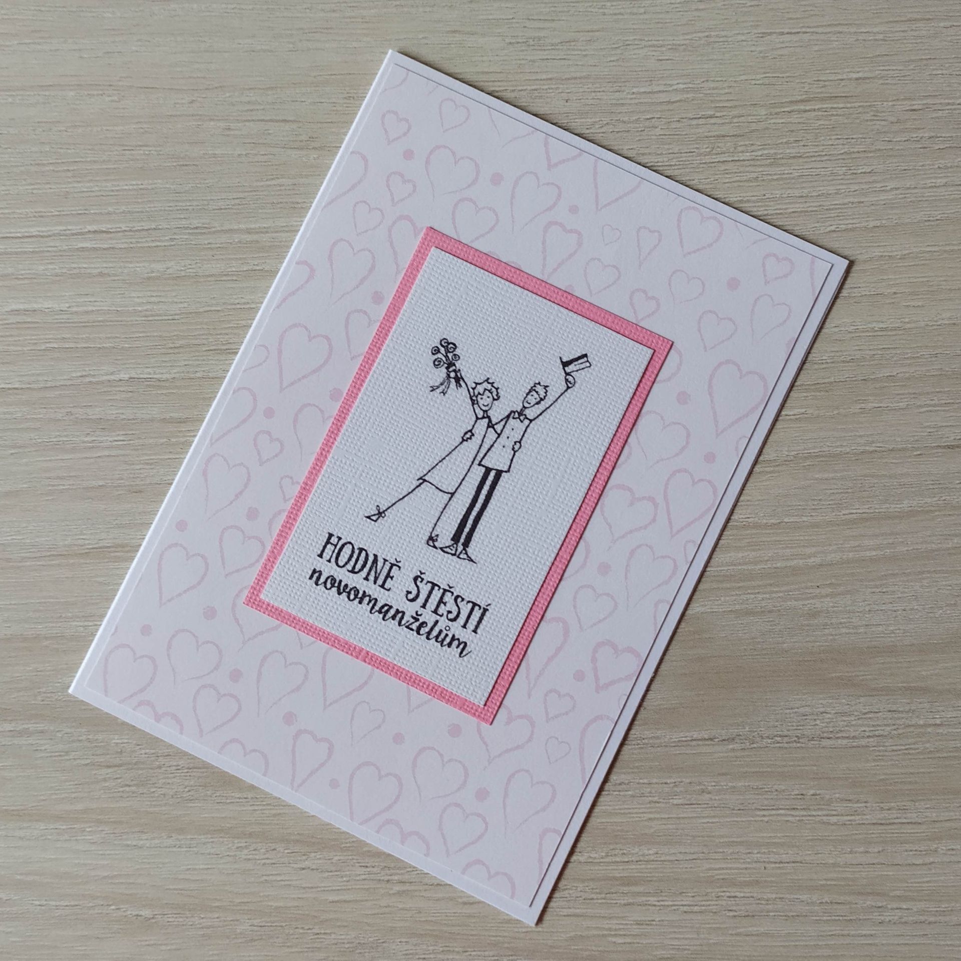 Ručně vyrobené blahopřání ze speciálních designových papírů. Blahopřání je zdobené originálním motivem se svatební tématikou. K přání patří také obálka. Podklad blahopřání i obálka jsou v barvě čistě bílé. Vše baleno v celofánovém sáčku. Blahopřání je uvnitř bez textu.