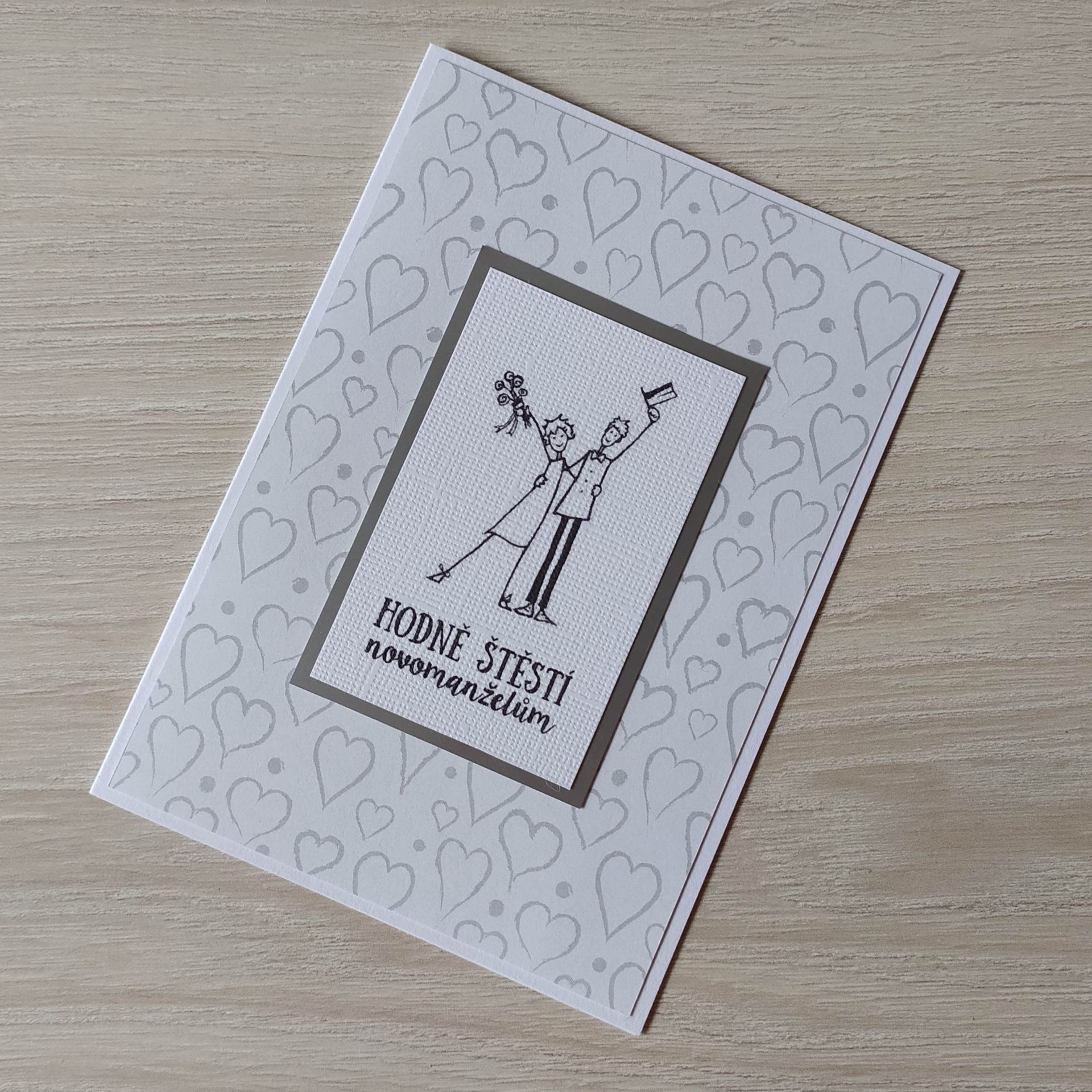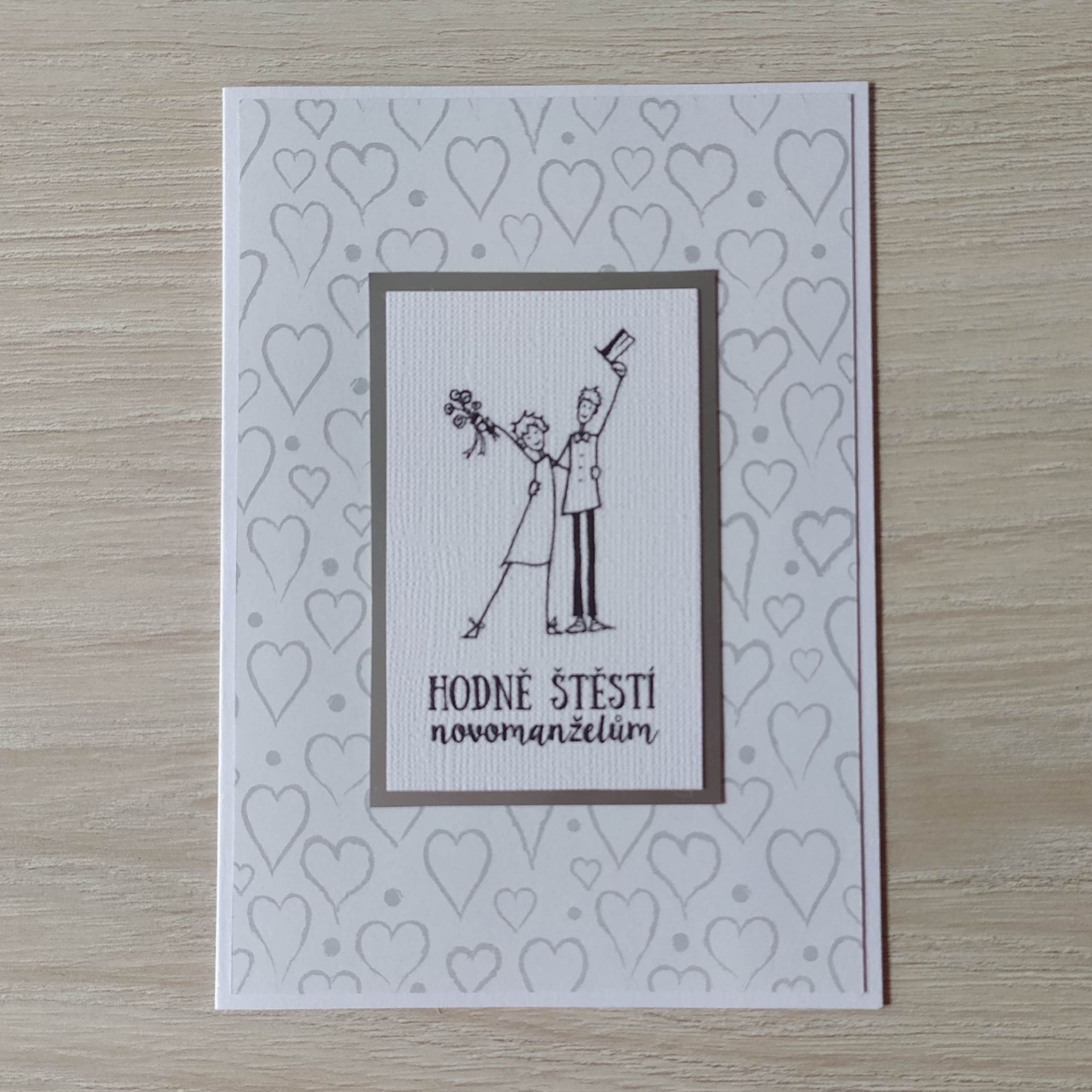 Ručně vyrobené blahopřání ze speciálních designových papírů. Blahopřání je zdobené originálním motivem se svatební tématikou. K přání patří také obálka. Podklad blahopřání i obálka jsou v barvě čistě bílé. Vše baleno v celofánovém sáčku. Blahopřání je uvnitř bez textu.