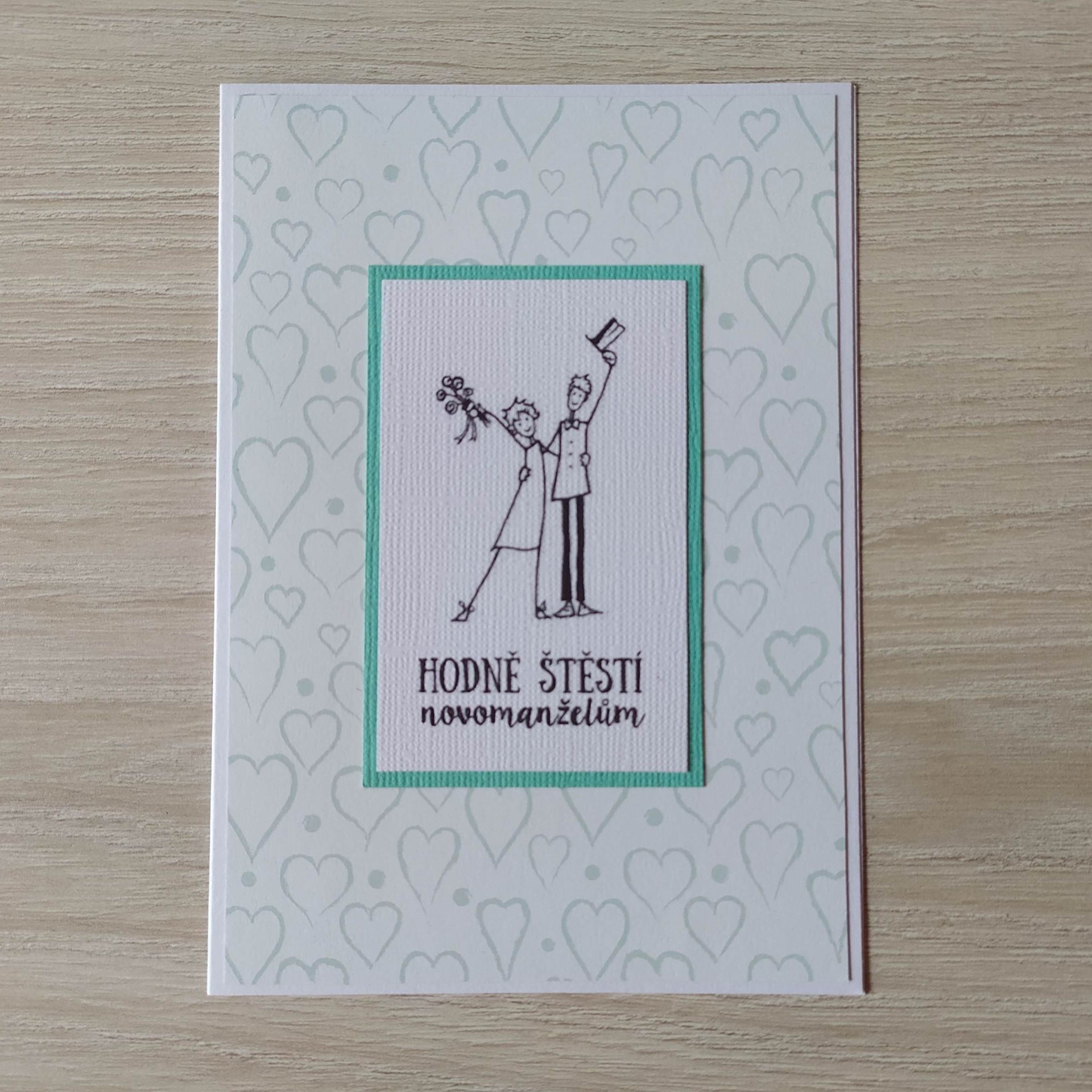 Ručně vyrobené blahopřání ze speciálních designových papírů. Blahopřání je zdobené originálním motivem se svatební tématikou. K přání patří také obálka. Podklad blahopřání i obálka jsou v barvě čistě bílé. Vše baleno v celofánovém sáčku. Blahopřání je uvnitř bez textu.