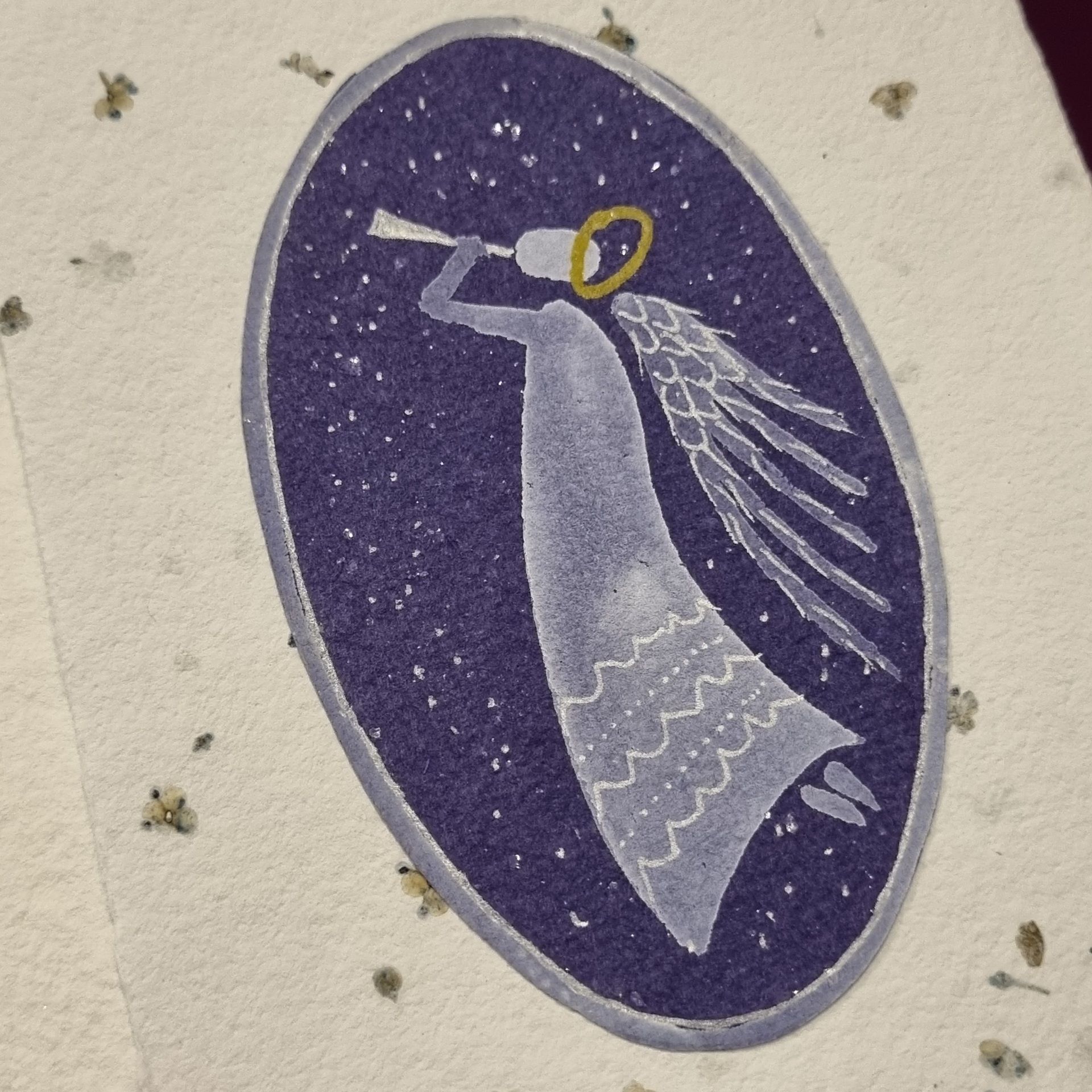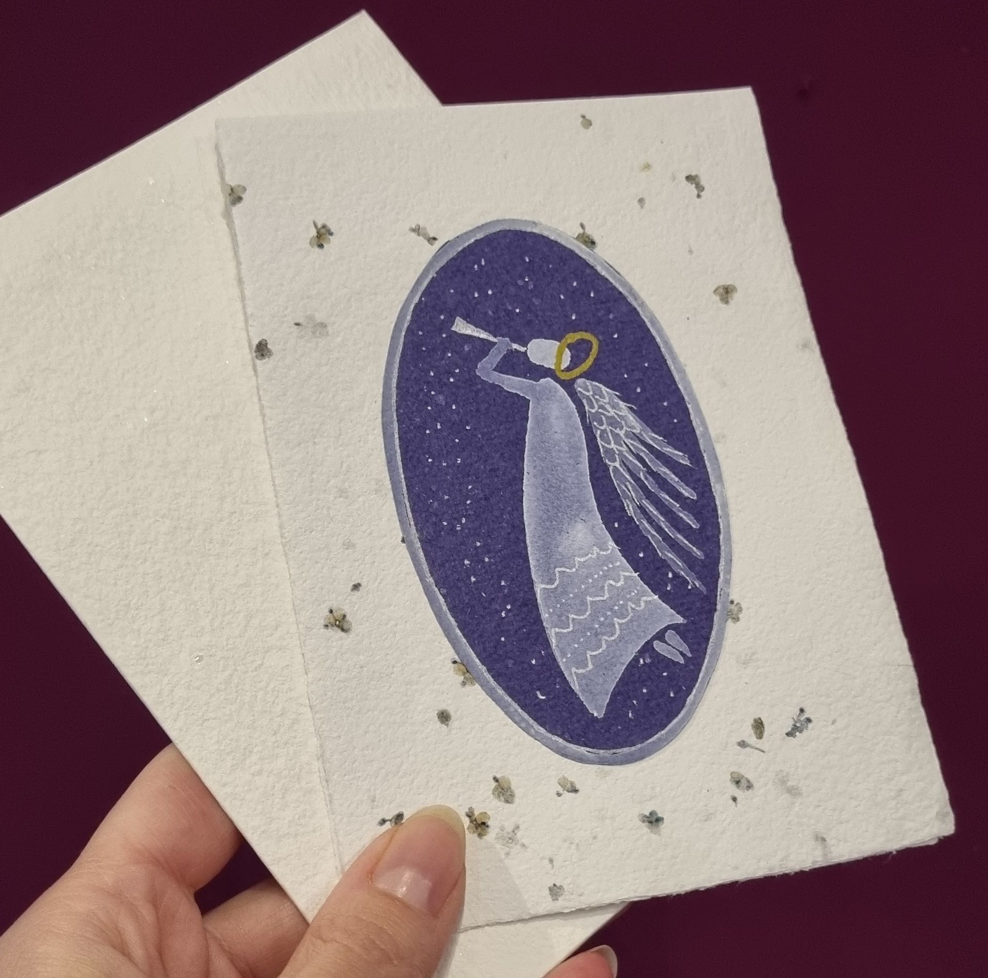 Jedná se o blahopřání z ručního papíru s originalní autorskou kresbou. Součástí blahopřání je také barevně sladěná obálka taktéž z ručního papíru.