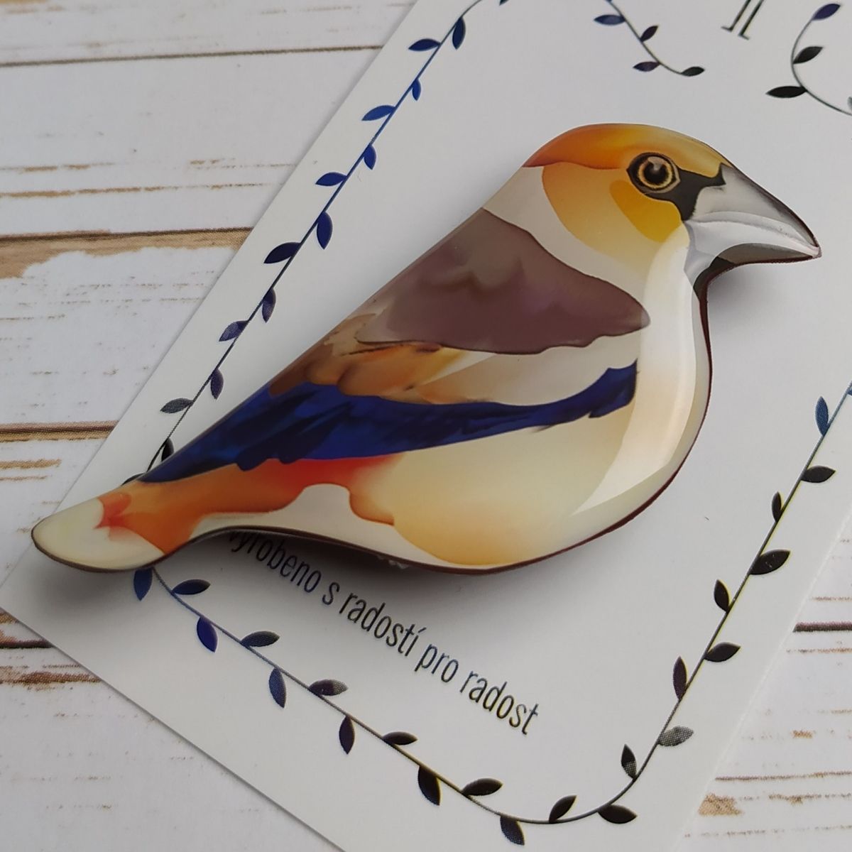 Ručně vyrobená brož z křišťálové pryskyřice, do které je zalitý autorský grafický motiv.