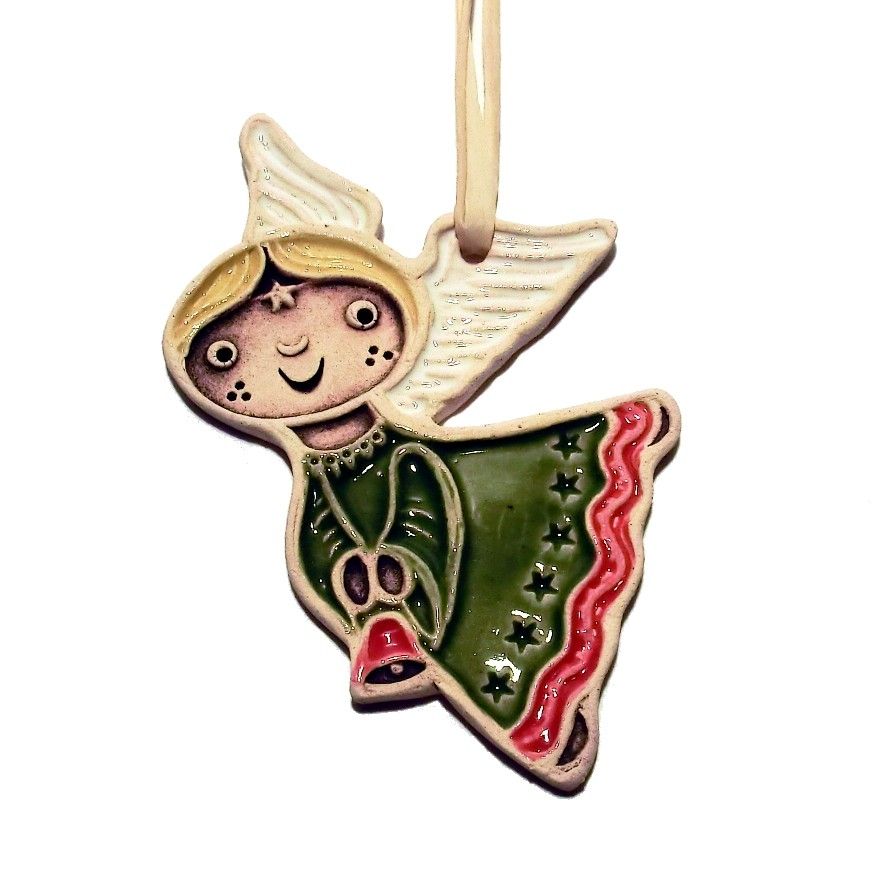 Keramická ozdůbka andílka zavěšená na lýku. Andílka lze zavěsit na vánoční stromeček, použít jako dekoraci na adventní věnec apod. Andílek je také vhodný jako drobný vánoční dárek pro radost.