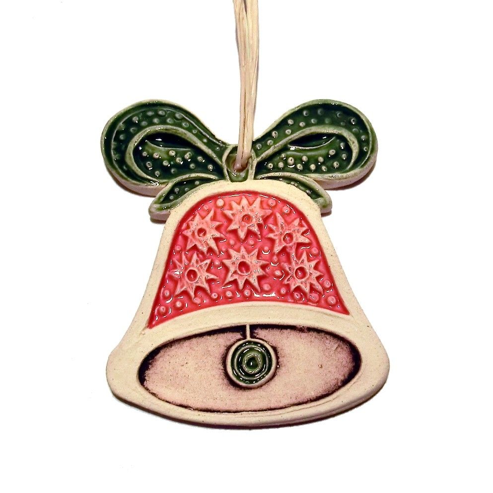 Keramická ozdůbka vánočního zvonečku zavěšená na lýku. Zvoneček lze zavěsit na vánoční stromeček, použít jako dekoraci na adventní věnec apod. Zvoneček je také vhodný jako drobný vánoční dárek pro radost.