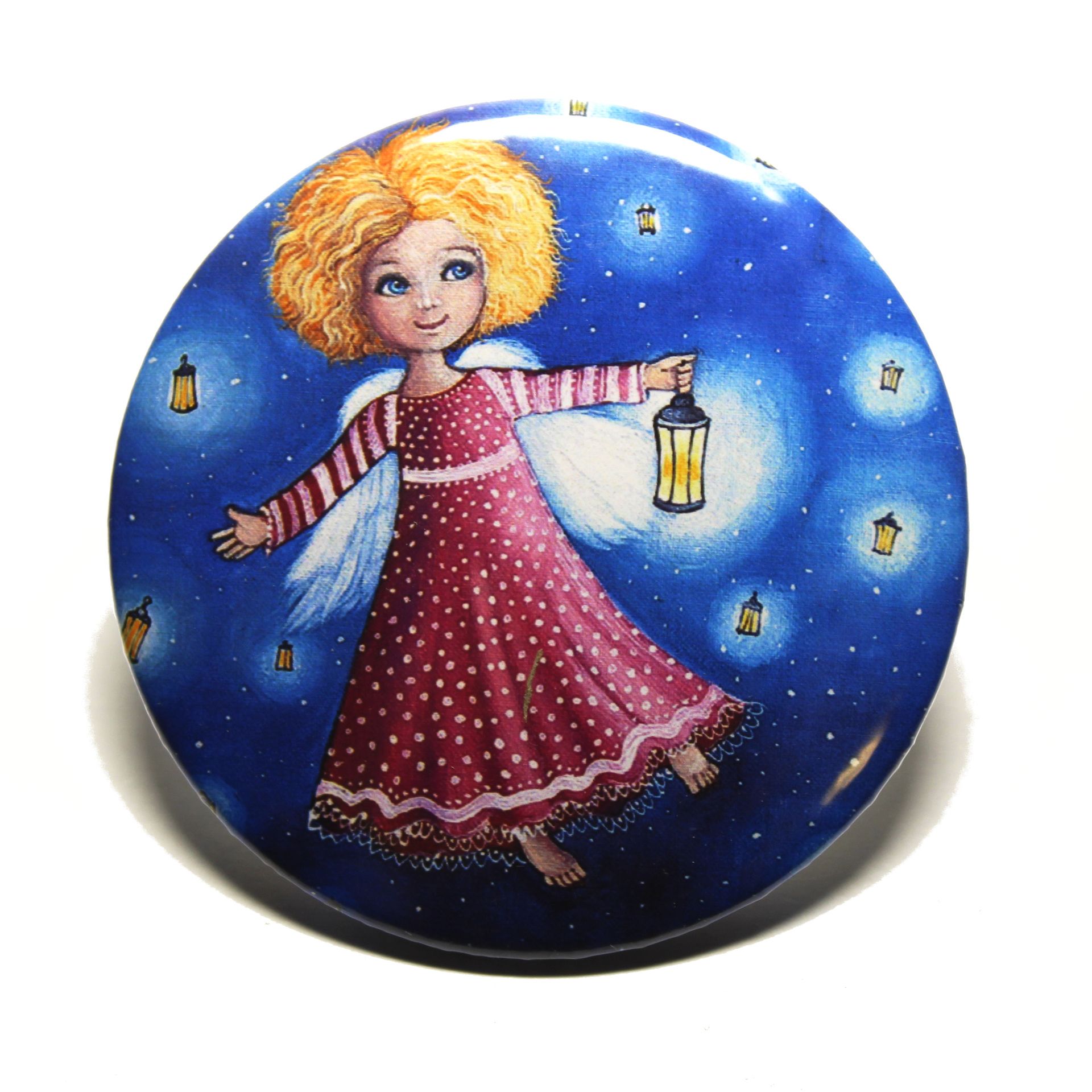 Kouzelné zrcátko s autorským motivem české výtvarnice. Z jedné strany je autorský motiv, z druhé strany klasické kosmetické zrcátko.