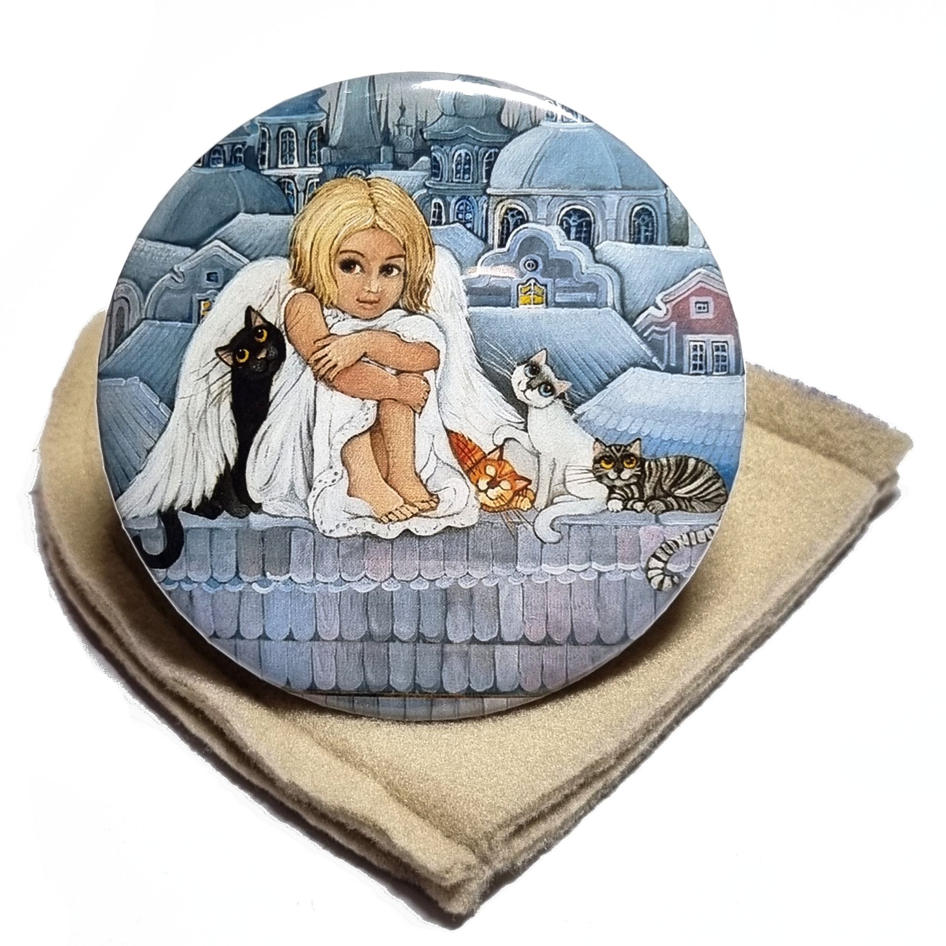 Velké kapesní zrcátko s autorským motivem české výtvarnice Zuzany Honsové. Z jedné strany je autorský motiv, z druhé strany klasické kosmetické zrcátko. K zrcátku patří měkká taštička, která zrcátko ochrání třeba v kabelce. Barva taštičky nemusí odpovídat fotografii. Barvy taštiček podle aktuální skladové zásoby.