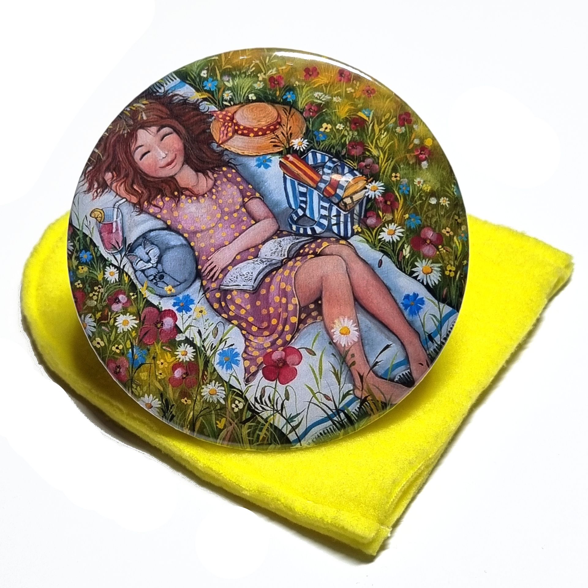 Velké kapesní zrcátko s autorským motivem české výtvarnice Zuzany Honsové. Z jedné strany je autorský motiv, z druhé strany klasické kosmetické zrcátko. K zrcátku patří měkká taštička, která zrcátko ochrání třeba v kabelce. Barva taštičky nemusí odpovídat fotografii. Barvy taštiček podle aktuální skladové zásoby.
