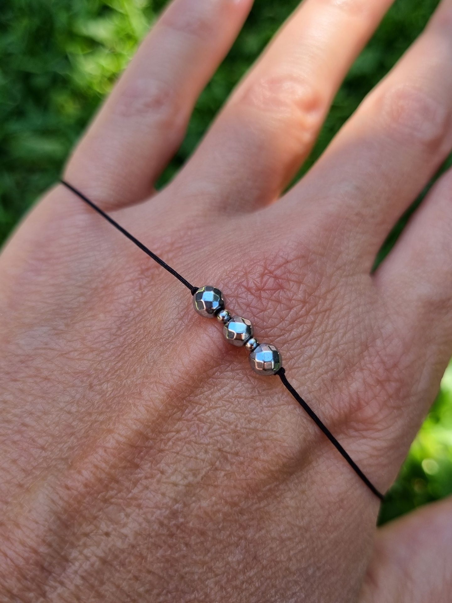 Šňůrkový náramek s drobnými minerálními korálky HEMATIT (4mm) zdobené nerezovými korálky. Korálky hematitu mají speciální povrchovou úpravu - jsou pokovené.