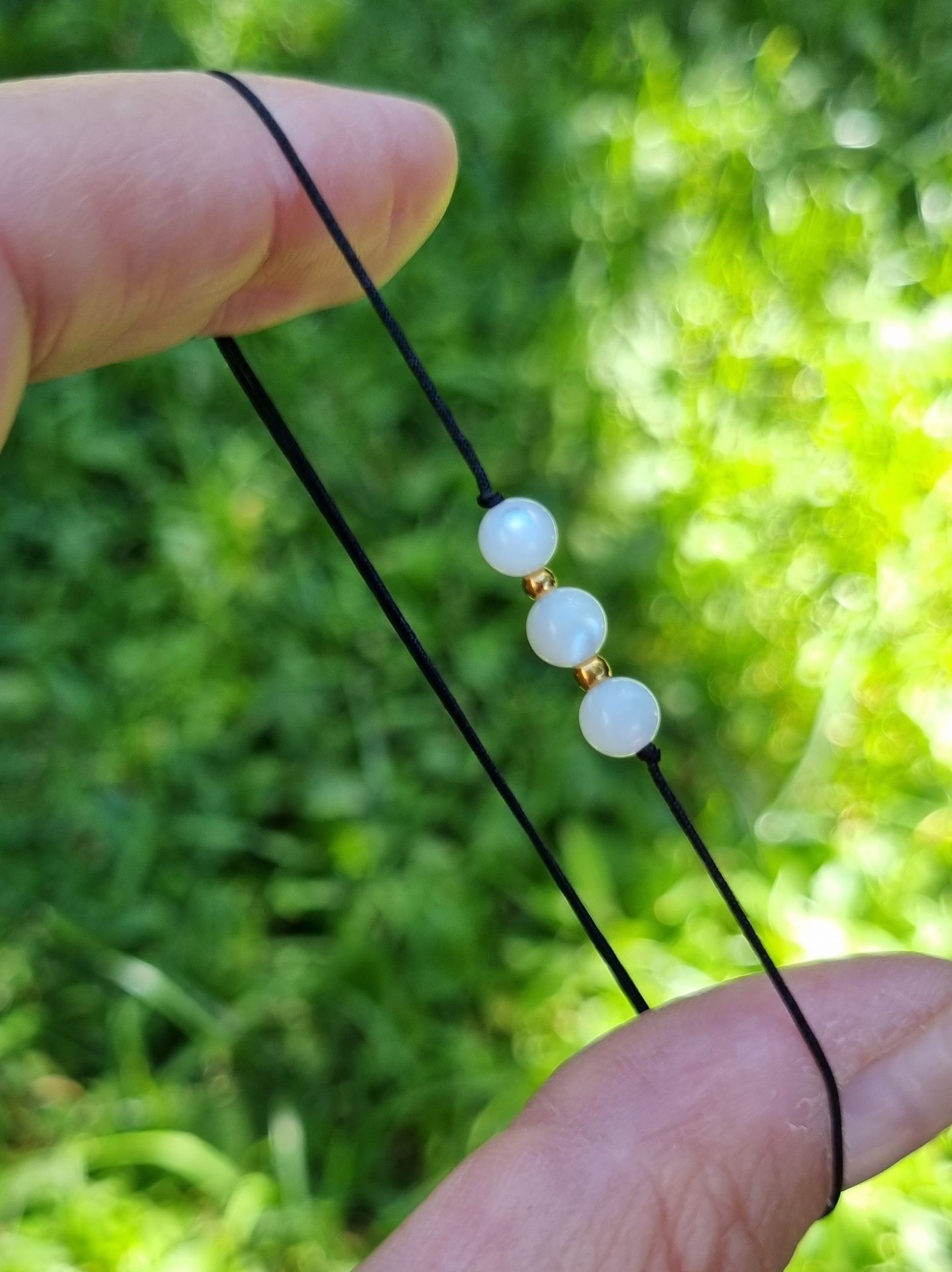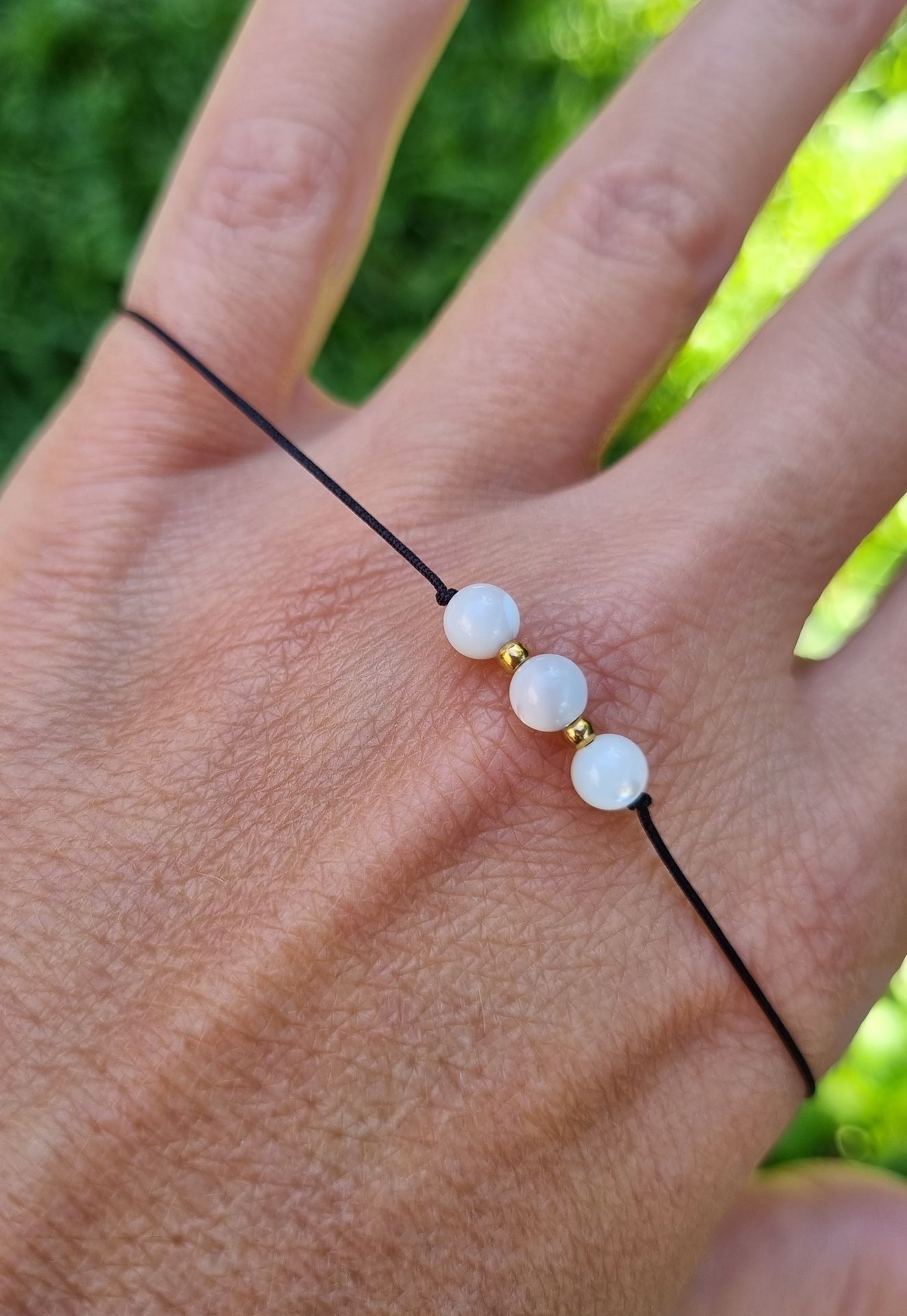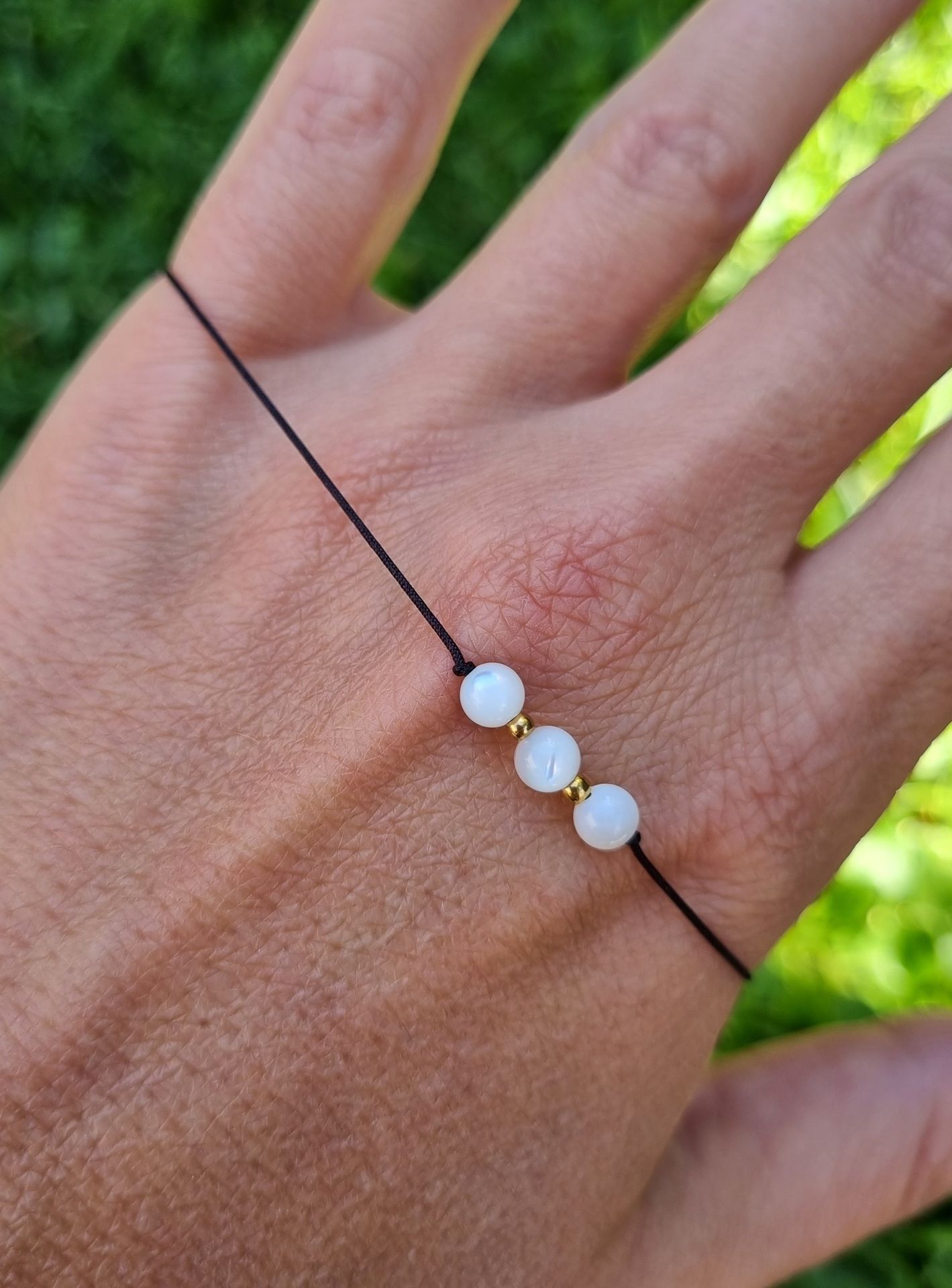 Náramek má nastavitelnou velikost díky posuvným uzlíkům. Jednoduše se tedy přizpůsobí šířce Vašeho zápěstí. Korálky jsou navlečeny na tenké pevné nylonové šňůrce.