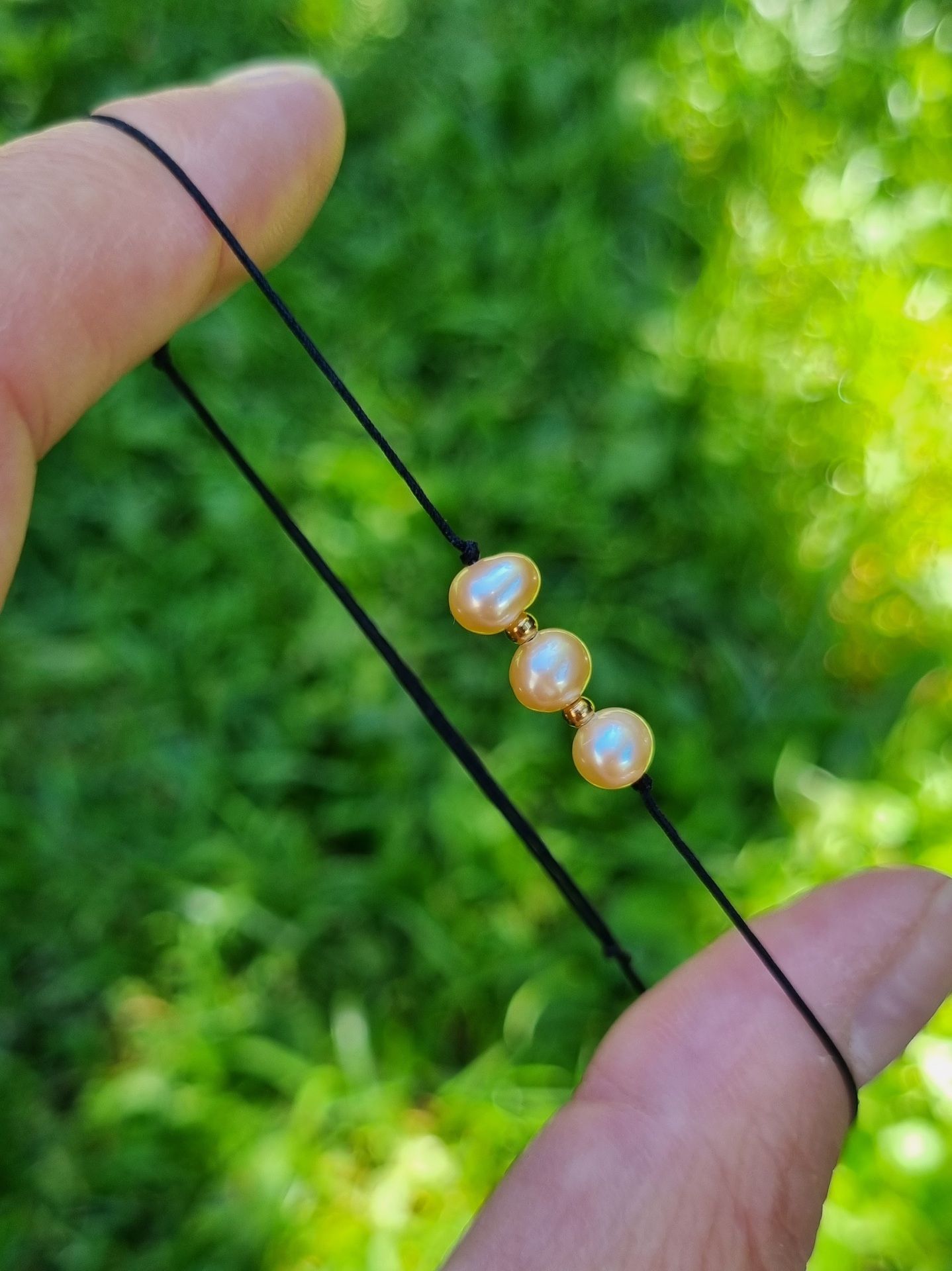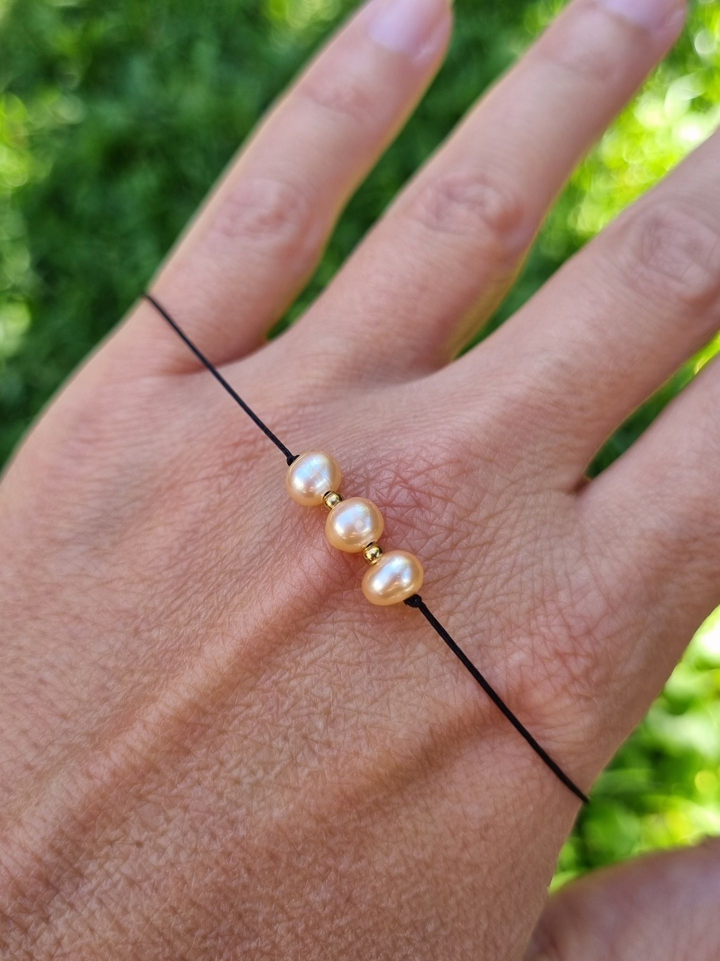 Šňůrkový náramek s drobnými korálky ŘÍČNÍ PERLY meruňkové (4mm) zdobené nerezovými korálky.