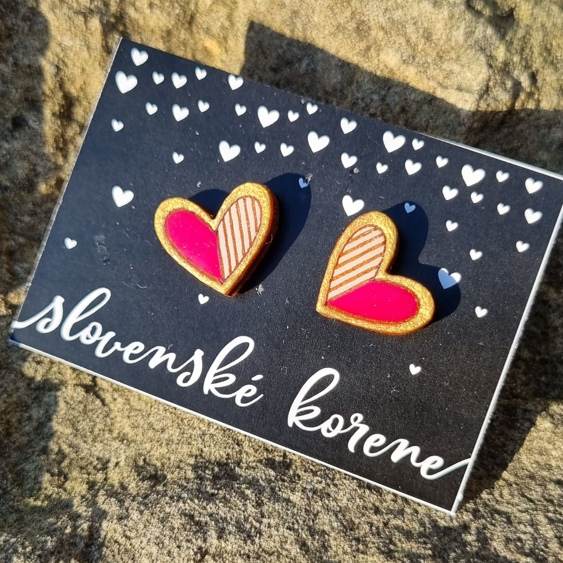 Dřevěné malované náušnice - srdíčka růžovozlatá