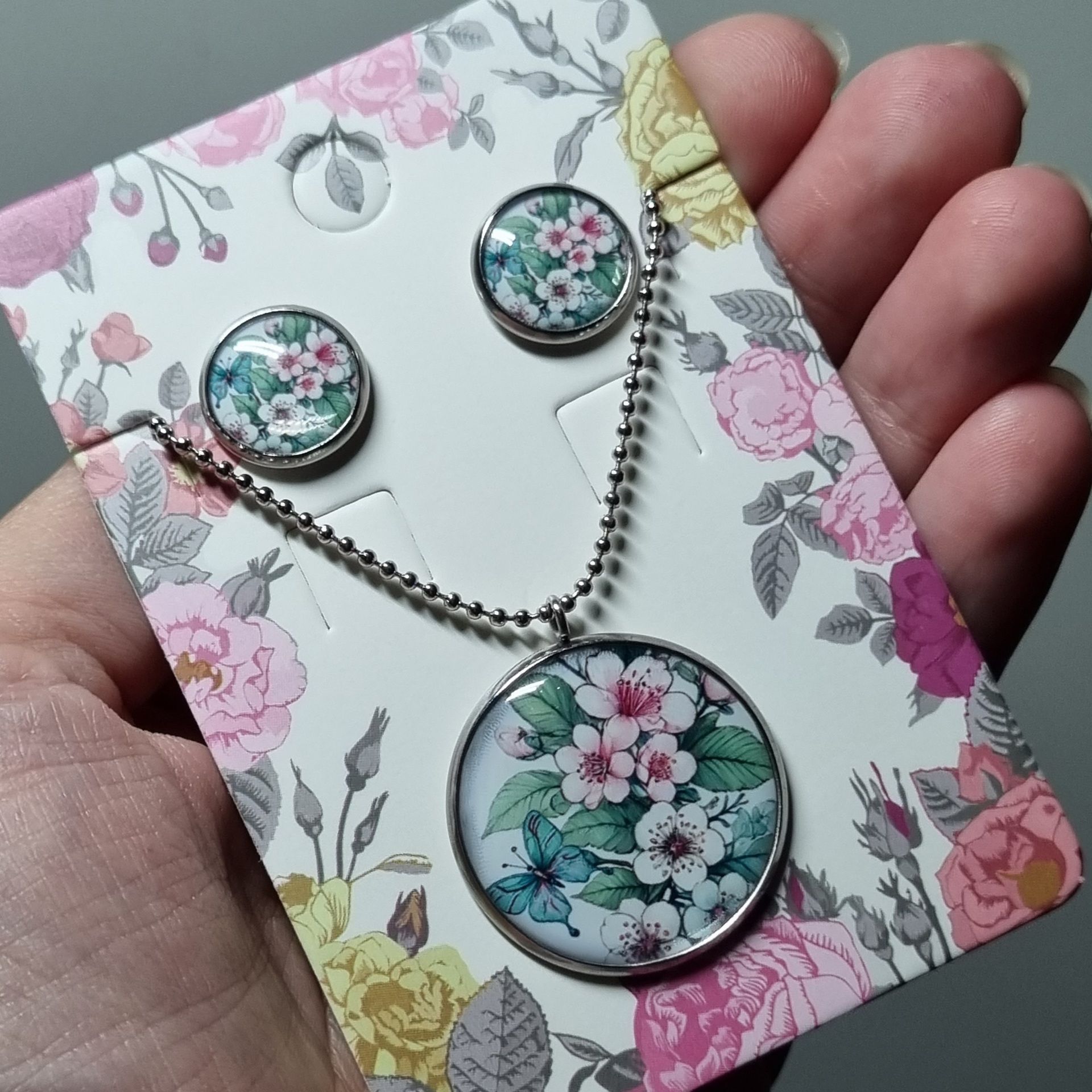 Souprava náušnic a přívěšku zavěšeného na kuličkovém řetízku o délce 60 cm.